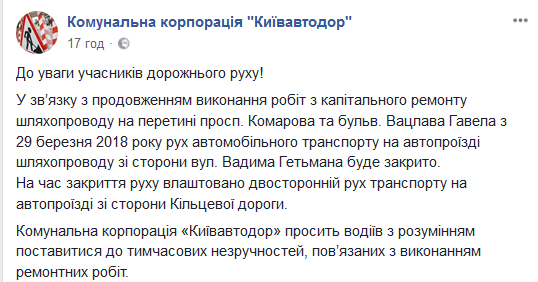 "В связи с продолжением выполнения работ по капитальному ремонту путепровода на пересечении просп. Комарова и б-ра Вацлава Гавела с 29 марта 2018 движение автомобильного транспорта на автопроезд путепровода со стороны ул. Вадима Гетьмана будет закрыто. На время ремонта устроено двустороннее движение транспорта по автопроезду со стороны Кольцевой дороги.
