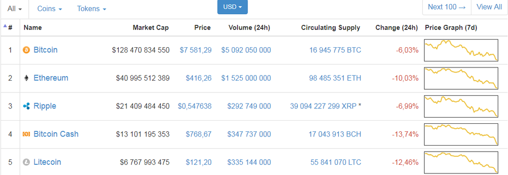 К 13:20 четверга, 29 марта курс ведущих криптовалют мира продолжил снижаться. Цена биткоина опустилась до $7 581,29.