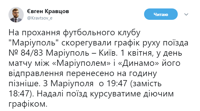 "По просьбе футбольного клуба "Мариуполь" скорректировали график движения поезда № 84/83 Мариуполь - Киев. 1 апреля, в день матча между "Мариуполем" и "Динамо" его отправления перенесено на час позже", - пишет он.