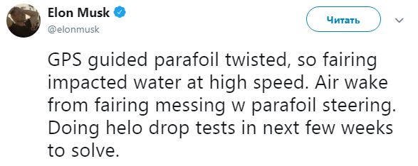 По его словам, из-за перекрутившегося парашюта обтекатель не смог совершить мягкую посадку и разбился о воду.