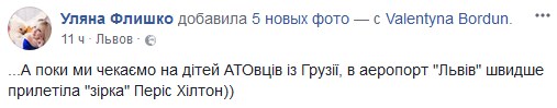 "А пока мы ждем детей АТОвцев из Грузии, в аэропорт "Львов" быстрее прилетела "звезда" Пэрис Хилтон", - написала волонтер Ульяна Флишко.