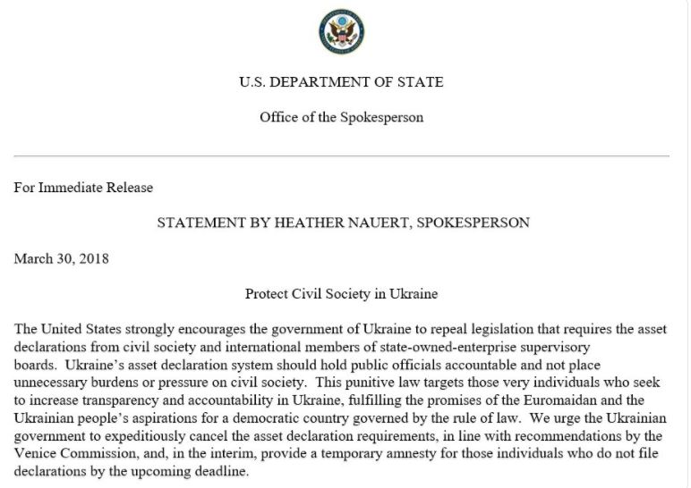 "Соединенные Штаты настоятельно рекомендуют правительству Украины отменить закон, который требует раскрывать активы участников гражданского общества и международных членов наблюдательных советов государственных предприятий", - отмечается в заявлении.