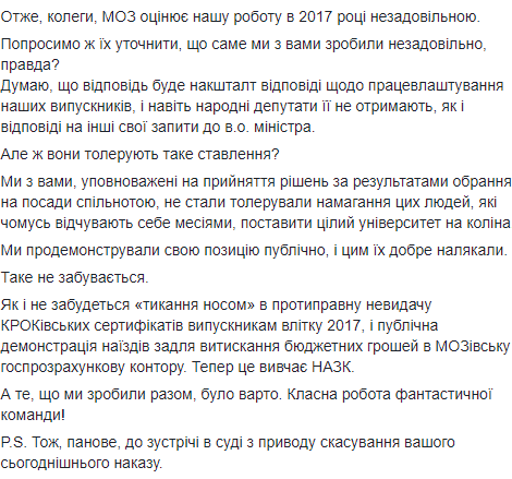 20 февраля Минздрав отстранил от работы ректора НМУ Амосову. Согласно сообщению, ректора отстранили из-за того, что студенты стоматологического факультета не смогли сдать обязательный для продолжения обучения экзамен "Шаг 1. Стоматология".