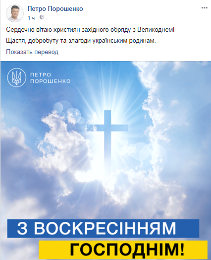 В воскресенье, 1 апреля, Петр Порошенко поздравил христиан западного обряда с Пасхой.