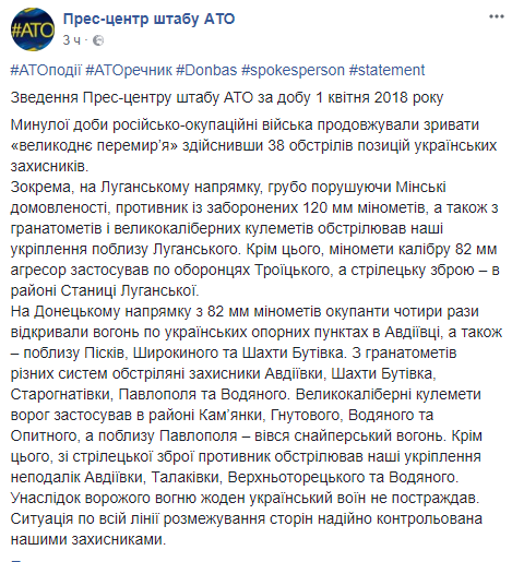 Также стало известно, что за прошедшие сутки российско-оккупационные войска срывали "Пасхальное перемирие", совершив 38 обстрелов позиций украинских защитников. Об этом на своей странице в Facebook сообщает пресс-центр штаба АТО.