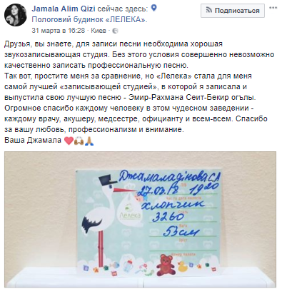 "Друзья, вы знаете, для записи песни нужна хорошая звукозаписывающая студия. Без этого условия абсолютно невозможно качественно записать профессиональную песню. Так вот простите меня за сравнение, но "Лелека" стала для меня лучшей "звукозаписывающей студией", в которой я записала и выпустила свою лучшую песню – Эмир-Рахмана Сеит-Бекир огълы", - написала звездная мама.