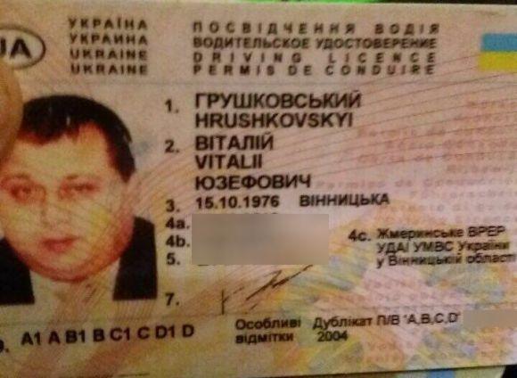 Кроме протокола, в сети была обнародована фотография водительского удостоверения Виталия Грушковского, изъятого у него после остановки патрульной полицией. На нем указана немного иная дата рождения - 15 октября 1976 года.