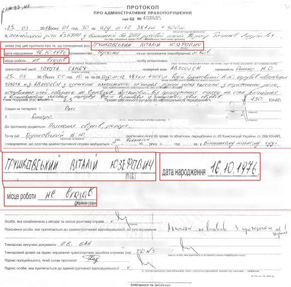 Между тем, журналисты винницкого издания 20minut.ua обнародовали оказавшийся в распоряжении редакции административный протокол, выписанный Грушковскому.