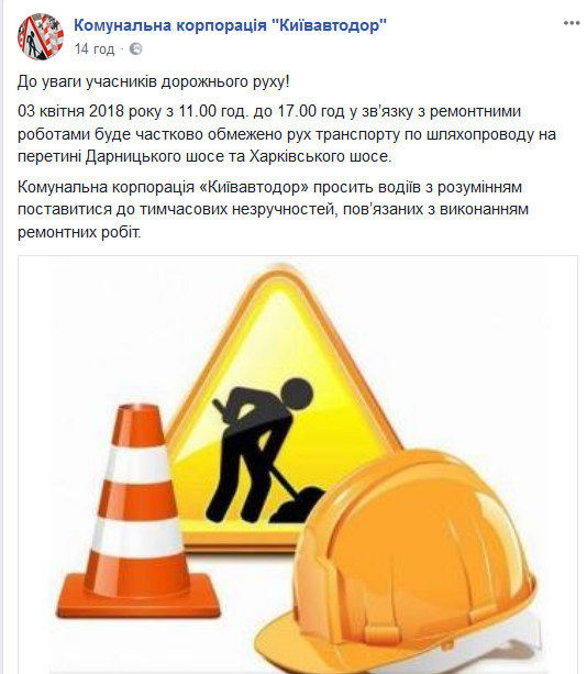 "3 апреля 2018 года с 11.00. до 17.00 в связи с ремонтными работами будет частично ограничено движение транспорта по путепроводу на пересечении Дарницкого шоссе и Харьковского шоссе. Коммунальная корпорация "Киевавтодор" просит водителей с пониманием отнестись к временным неудобствам, связанным с выполнением ремонтных работ", - уточнили в пресс-службе Киевавтодора.