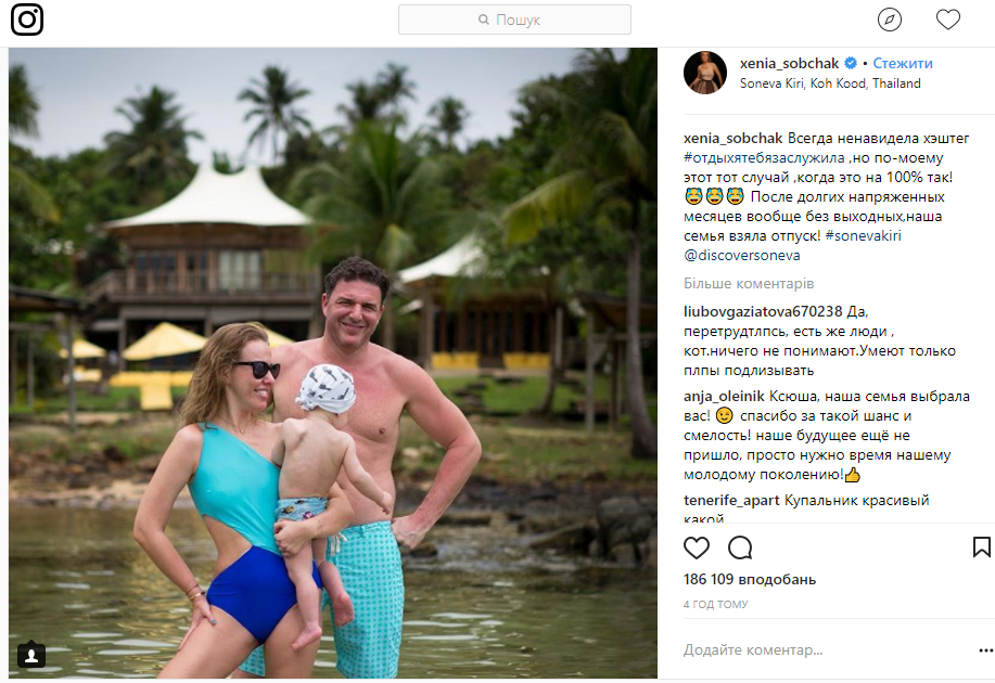 "Всегда ненавидела хэштег #отдыхятебязаслужила,но по-моему этот тот случай ,когда это на 100% процентов так! После долгих напряженных месяцев вообще без выходных наша семья взяла отпуск", - написала Собчак в Инстаграм.
