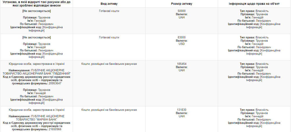 Об этом говорится в е-декларации Труханова за прошлый год на сайте НАПК.