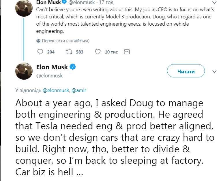 "Около года назад я попросил Дага заняться и проектированием, и производством. Он согласился, что Tesla нужно лучше совмещать эти области, чтобы мы не разрабатывали машины, которые безумно трудно строить. Однако сейчас лучше разделять и властвовать, так что я снова буду спать на заводе. Автобизнес - это ад", - написал Маск в Twitter.