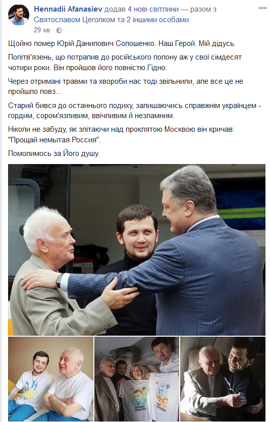 "Только что умер Юрий Данилович Солошенко. Наш Герой. Мой дедушка. Политзаключенный, попавший в русский плен в свои семьдесят четыре года. Он прошел его полностью и достойно.