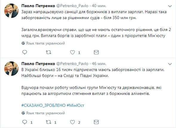 "Сейчас нарабатываем санкции для должников по выплате зарплат. Сейчас такая задолженность только по решениям судов - около 350 млн грн. В общем, учитывая дела, которые еще не имеют окончательного решения, это около 2 млрд грн. Выплата долгов по заработной плате - один из приоритетов Минюста", - говорится в сообщении.