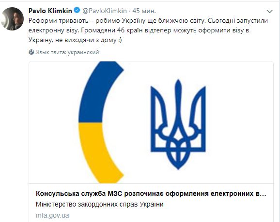 "Реформы продолжаются - делаем Украину еще ближе к миру. Сегодня запустили электронную визу. Граждане 46 стран отныне могут оформить визу в Украину, не выходя из дома", - написал Климкин и добавил ссылку на соответствующее сообщение консульской службы.