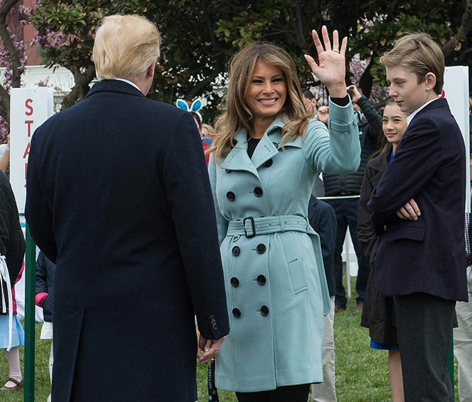 Первая леди была в нежно-голубом кашемировом тренче Burberry за 2595 долларов, черных джинсах и замшевых сапогах почитала детям сказку, а затем отправилась на прогулку по лужайке вместе с супругом и сыном Бэрроном, периодически получая от довольного мужа поцелуй - назло всем слухам, в семье Трамп все отлично.