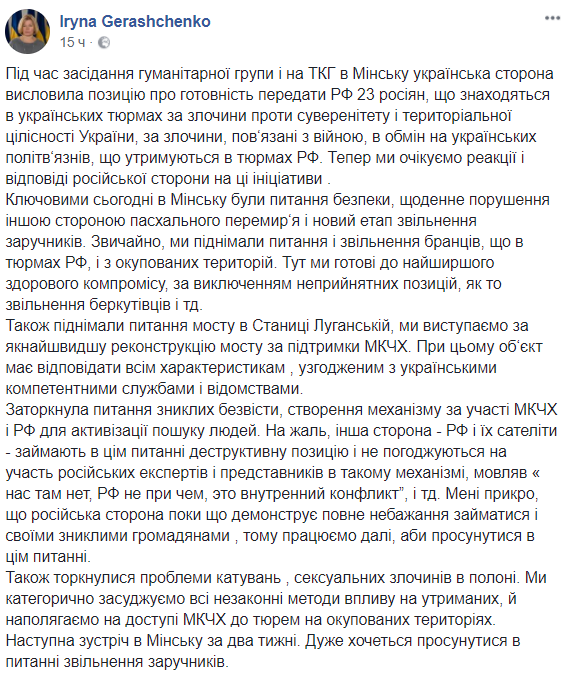 "Во время заседания гуманитарной группы в Минске украинская сторона выразила позицию о готовности передать РФ 23 россиян, находящихся в украинских тюрьмах за преступления против суверенитета и территориальной целостности Украины, за преступления, связанные с войной, в обмен на украинских политических заключенных, содержащихся в тюрьмах РФ.