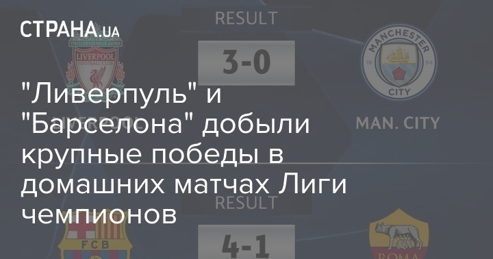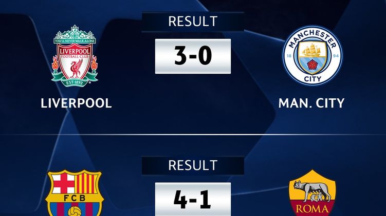 Как сообщается на официальном сайте соревнований, "Ливерпуль" крупно обыграл "Манчестер Сити" со счетом 3:0, а "Барселона" разгромила "Рому" - 4:1.