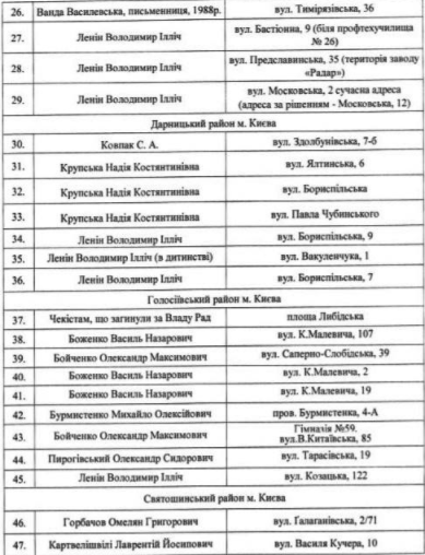 По его данным, к списку из 47 памятников и памятных знаков, демонтированных в 4 районах столицы с абсолютным лидерством Печерского района, добавились 17 объектов в Шевченковском районе, 8 демонтированных службами Днепровской РГА памятных досок лицам, причастным к голодомору 1932-1933 гг, а так же памятники Ленину с территории предприятий Святошинского района.