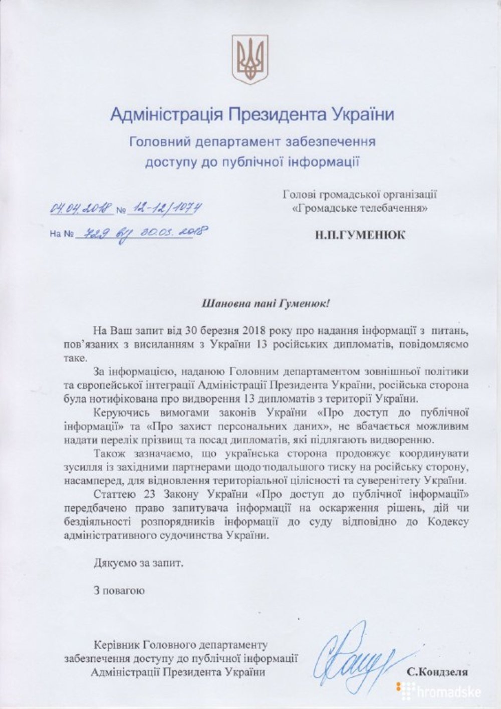 В ответ на запрос Громадского  в Администрации сослались на закон о защите персональных данных и отметили, что "не представляется возможным предоставить перечень фамилий и должностей дипломатов, подлежащих выдворению".
