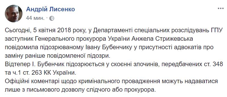"Сегодня, 5 апреля 2018 года, в департаменте специальных расследований ГПУ заместитель Генерального прокурора Украины Анжела Стрижевская сообщила подозреваемому Ивану Бубенчику в присутствии адвокатов об изменении ранее сообщенного подозрения", - написал Лысенко.