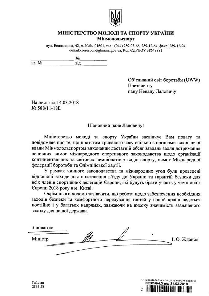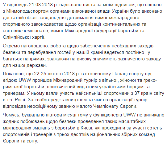 “На всех встречах высокого уровня руководству UWW отмечалось, что во время подготовки к соревнованиям правительством будут созданы условия, гарантирующие безопасность и уважение к каждому спортсмену в полном соответствии с международными правилами и действующим законодательством Украины. Однако отдельно было отмечено, что спортсмены, которые незаконно находились на оккупированных территориях Украины — в Крыму, отдельных районах Донецкой и Луганской областей, к соревнованиям допущены не будут”, - отметил Жданов.