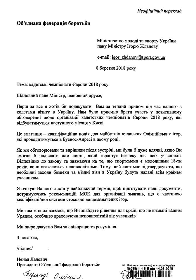 Министр также обнародовал переписку с президентом федерации борьбы Нанадом Лаловичем по подготовке соревнований и обеспечения безопасности.