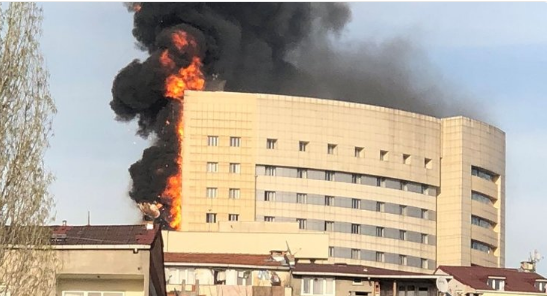 Пожар начался на крыше больницы и быстро распространился по внешней облицовке здания. Сейчас на месте работают пожарные. Над зданием поднялся огромный столб черного дыма, который виден из отдаленных районов города, пишет Hurriyet. Также сообщают о звуке взрыва.