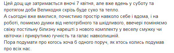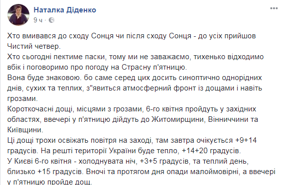 "Кто умывался до восхода солнца или после восхода солнца - ко всем пришел Чистый четверг. Кто сегодня будет печь пасхи, тому мы не будем мешать, тихонько отойдем в сторону и поговорим о погоде на Страстную пятницу. Она будет знаковой, потому что именно среди этих достаточно синоптически однородных дней, сухих и теплых, появится атмосферный фронт с дождями и даже грозами", - написала она.