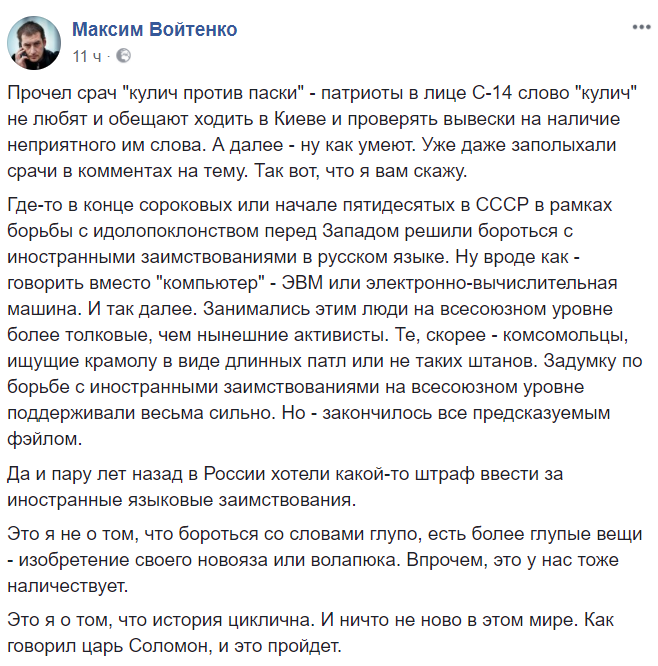 Но нашлись и такие, кто считает, что даже слово "паска" – не совсем подходящее для украинцев. Один из пользователей заявил, что оно происходит из еврейского языка. На что глава С14 ответил потоком оскорблений и напомнил, что кулич – тоже не славянское, а греческое слово.
