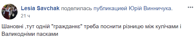 Пост Карася понравился многим Facebook-спикерам Радикальной партии, волонтерам АТО и националистам из ОУН. А в комментариях начали публиковать фотографии этикеток украинской продукции с надписью "кулич".