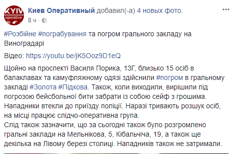 Отмечается, что 6 апреля также были разгромлены игорные заведения на ул. Мельникова, 5, Кибальчича, 19, а также еще несколько на Левом берегу столицы. Нападающих также не задержали.