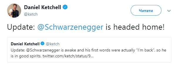Легендарный голливудский актер и бывший губернатор Калифорнии Арнольд Шварценеггер выписался из больницы. Об этом в Twitter сообщил его представитель Дэниэл Кетчелл.