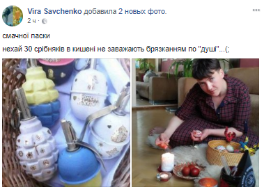 Отметим, женщина разместила два фото. На первом - сине-желтого цвета и с надписями "Христос Воскрес" боевые гранаты Ф-1 и РГД-5. А на втором - Надежда Савченко, которая разрисовывает пасхальные яйца.
