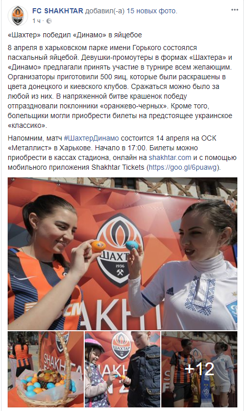 8 апреля в харьковском парке имени Горького состоялся пасхальный яйцебой. Девушки-промоутеры в формах "Шахтера" и "Динамо" предлагали принять участие в турнире всем желающим. Организаторы приготовили 500 яиц, которые были раскрашены в цвета донецкого и киевского клубов. Сражаться можно было за любой из них. В напряженной битве крашенок победу отпраздновали поклонники "оранжево-черных".