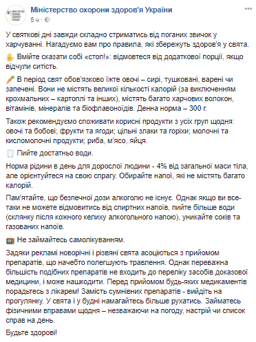 В Минздраве опубликовали предостережения и советы в вопросах питания в праздничные дни. Об этом сообщают на странице ведомства в Facebook.