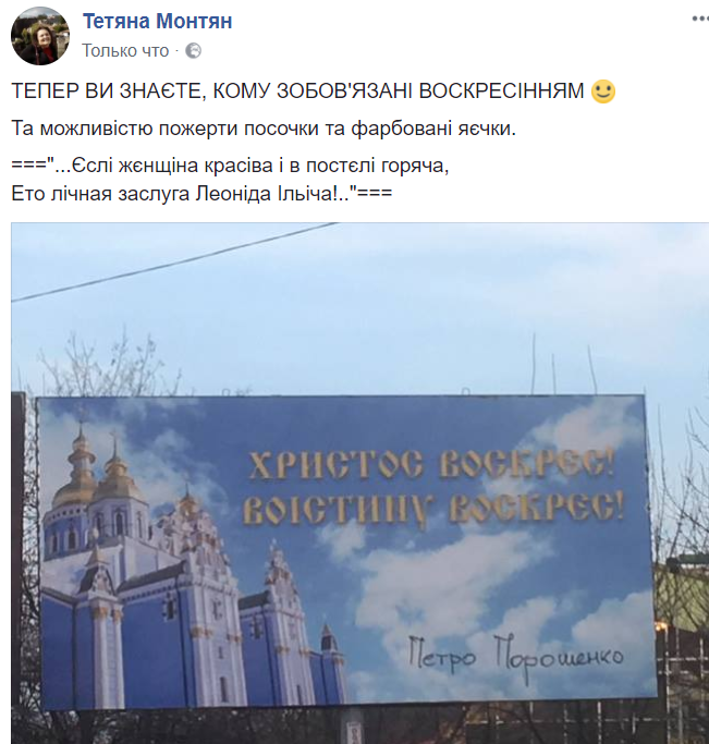 09:27 В Сети продолжают обсуждать пасхальные биг-борды Порошенко. "Теперь мы знаем, кому мы обязаны воскресением", - иронизирует адвокат Татьяна Монтян.