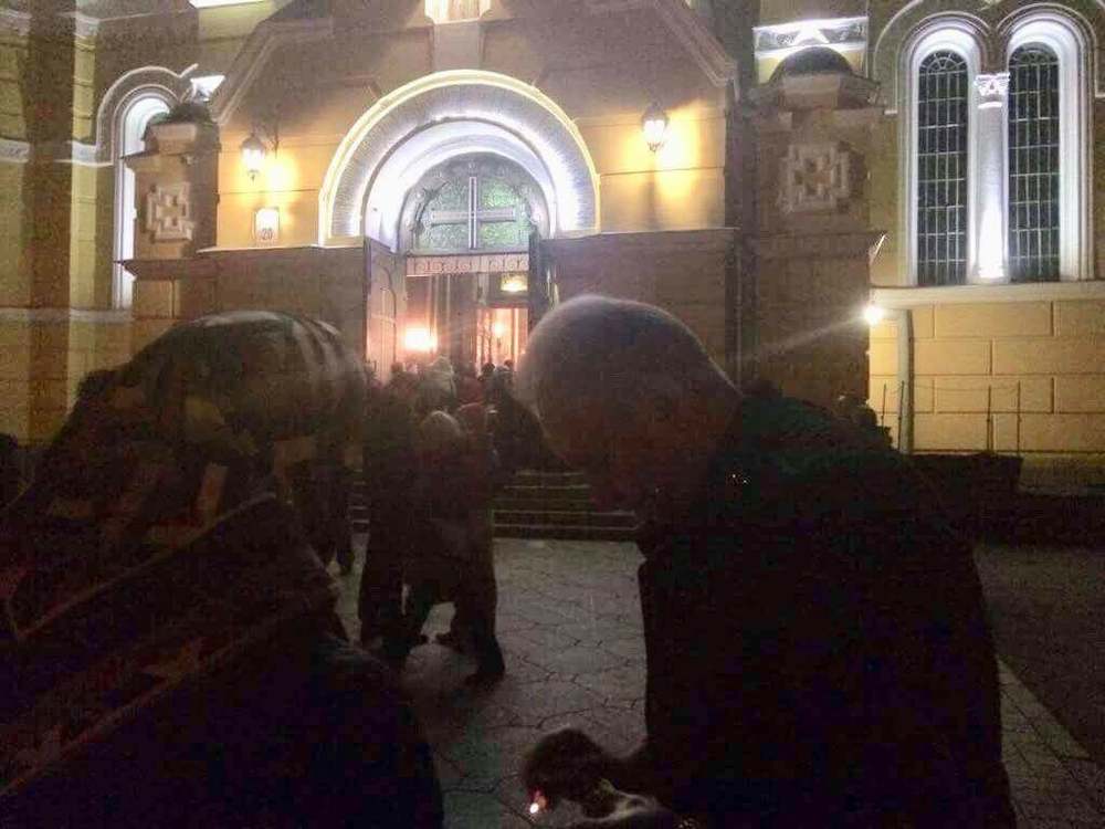 08:00 Президент Петр Порошенко в пасхальную ночь приехал помолиться в три церкви. Сначала во Владимирском соборе УПЦ КП, где он встретил собственно Пасху.