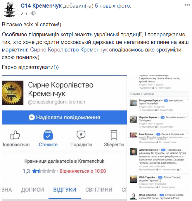 09:40 Радикалы из С-14 продолжают вредить владельцам торговых марок, которые использовали в названии слово "кулич". Они избрали тактику понижения им рейтинга в Facebook - массово заходят на брендовые страницы и ставят оценку 1 - сопровождая это характерными комментариями.