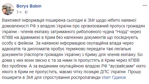 "По имеющейся информации оккупационная власть через адвокатов и дипломатов пытается срочно передать такие легальные документы (паспорта граждан Украины - Прим.Ред.) из Крыма для членов экипажа. Потому что дома у них они, конечно, есть, и по ним их пропустят в Крым через КПВВ без проблем", - сообщил он.