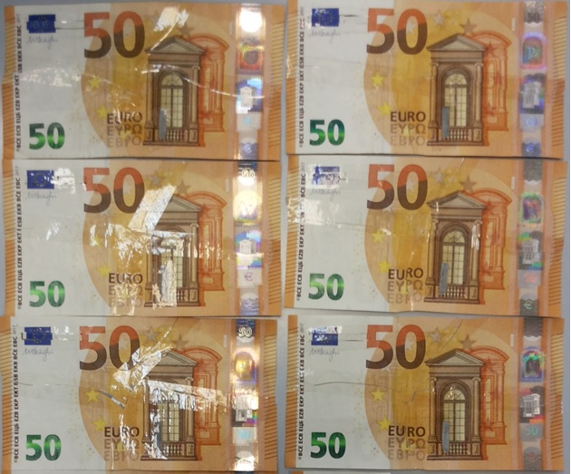 "Вертикальный серийный номер в банкнот вырезан. Горизонтальный серийный номер - составленный из вырезанных отдельных фрагментов серийных номеров различных настоящих банкнот евро, что склеенные прозрачной клейкой лентой", - отмечается в нацбанковском документе.