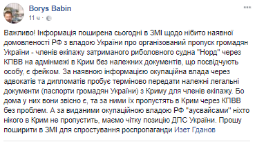 "Информация, распространенная сегодня в СМИ о якобы имеющейся договоренности России с властью Украины об организованном пропуске граждан Украины - членов экипажа задержанного рыболовецкого судна "Норд'' через КПВВ на административной границе с Крымом без надлежащих документов, удостоверяющих личность, является фейком", - написал он.