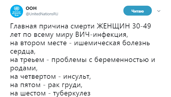 "Главная причина смерти женщин 30-49 лет по всему миру - ВИЧ-инфекция, на втором месте - ишемическая болезнь сердца, на третьем - проблемы с беременностью и родами, на четвертом - инсульт, на пятом - рак груди, на шестом - туберкулез", - говорится в сообщении.