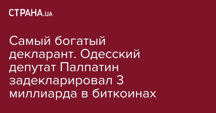 Самым богатым декларантом Украины оказался депутат Одесского горсовета от "Доверяй Делам" Дмитрий Палпатин. Его состояние превышает 3 миллиарда в биткоинах.