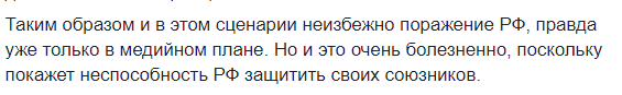 Таким образом и в этом сценарии неизбежно поражение РФ, правда уже только в медийном плане. Но и это очень болезненно, поскольку покажет неспособность РФ защитить своих союзников".