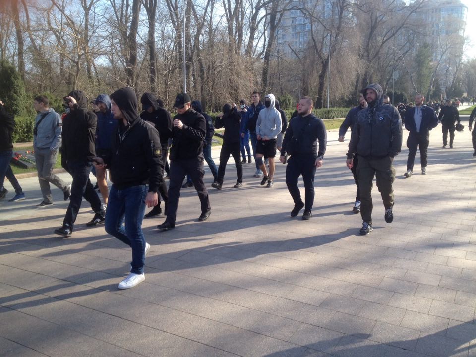 Их около 60 человек во главе с лидером Демьяном Ганулом. Они сожгли георгиевскую ленту, которую кто-то положил к памятнику Неизвестному матросу.