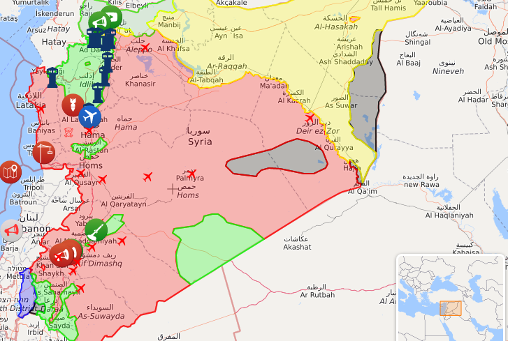 Красным - территория, контролируемая сирийской армией. "Зеленые" - вооруженная оппозиция, "черные" - ИГИЛ, "желтые" - курды.