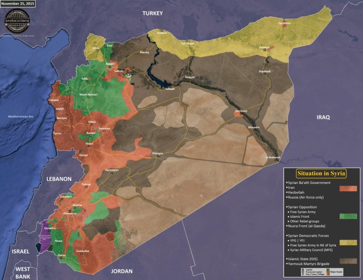 ИГИЛ контролировал большую часть территории Сирии и продвигался дальше. В тот момент сирийские войска атаковались с востока, севера и юга. Внутри правительственной территории были многочисленные воюющие группировки боевиков.