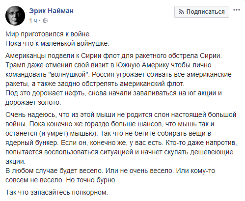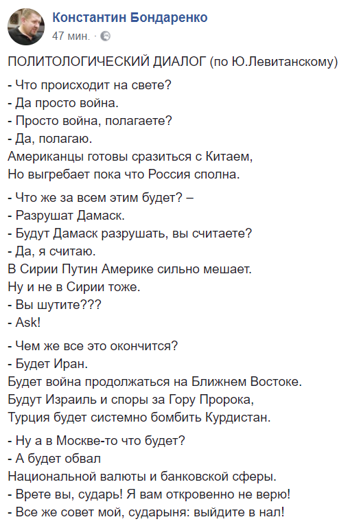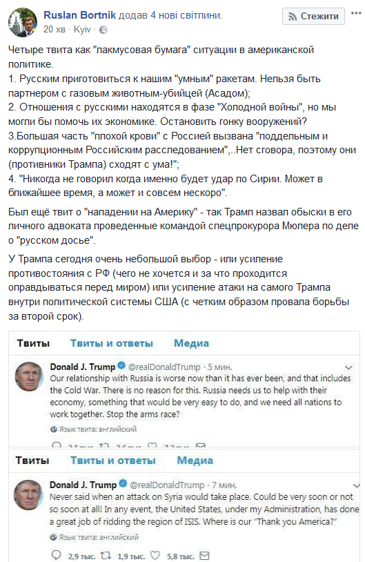 10:24 В соцсетях продолжают активно обсуждать твиты Дональда Трампа о ситуации в Сирии. Вот что. к примеру, написал, в своем Facebook политолог Руслан Бортник.