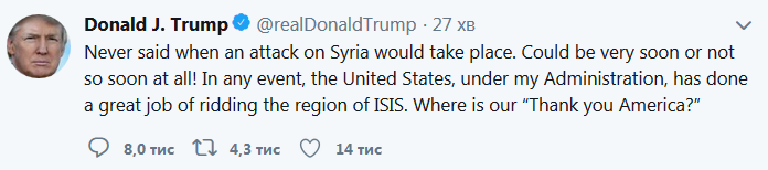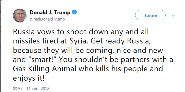 "Россия обещает сбить все ракеты, выпущенные по Сирии. Приготовьтесь в России, потому что они прилетят, славные, новые и "умные!". Вы не должны быть партнером для животного, убивающего своих граждан и наслаждающегося этим!" – написал Трамп.